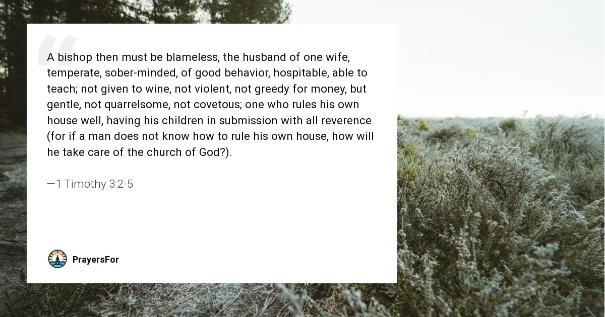 A bishop then must be blameless, the husband of one wife, temperate, sober-minded, of good behavior, hospitable, able to teach; not given to wine, not violent, not greedy for money, but gentle, not quarrelsome, not covetous; one who rules his own house well, having his children in submission with all reverence (for if a man does not know how to rule his own house, how will he take care of the church of God?)