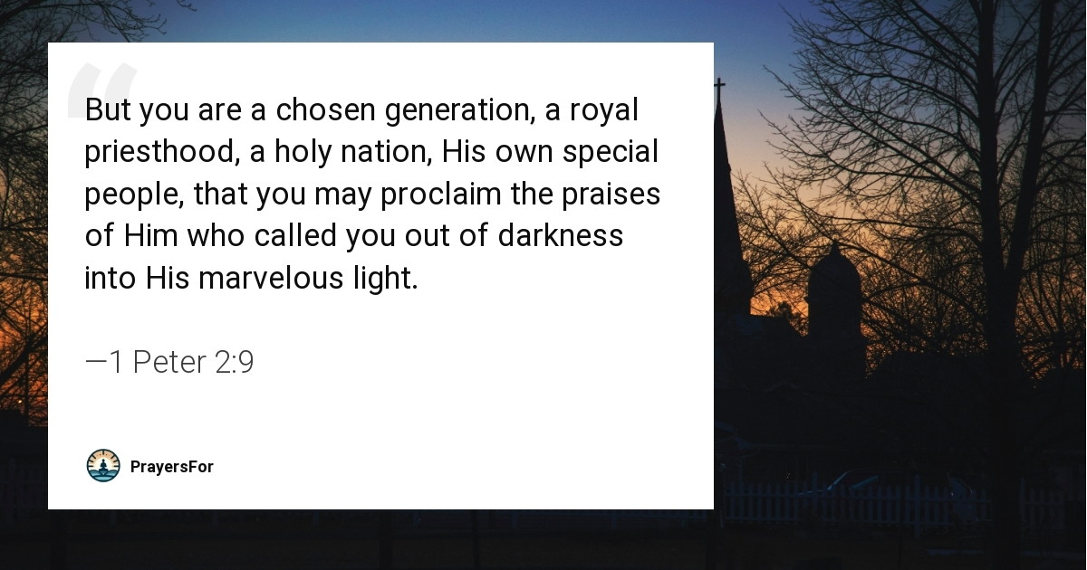 But you are a chosen generation, a royal priesthood, a holy nation, His own special people, that you may proclaim the praises of Him who called you out of darkness into His marvelous light.